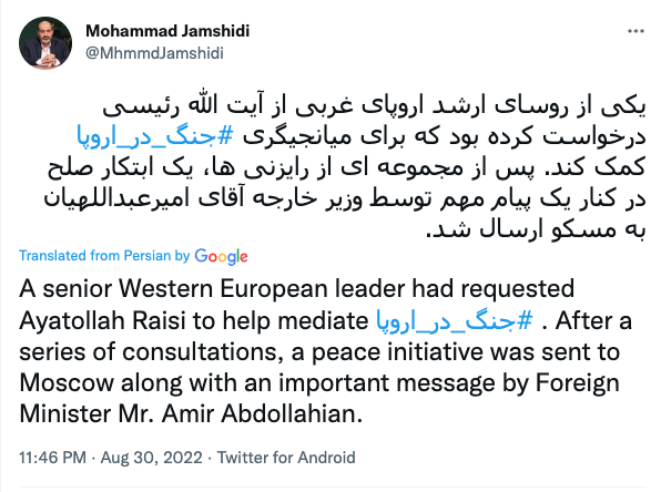 Заместитель главы администрации президента Ирана Мохаммад Джамшиди заявил, что "один из высокопоставленных лидеров Западной Европы обратился к президенту Ирана с просьбой выступить посредником в войне на Украине". Об этом Джамшиди написал в Twitter.