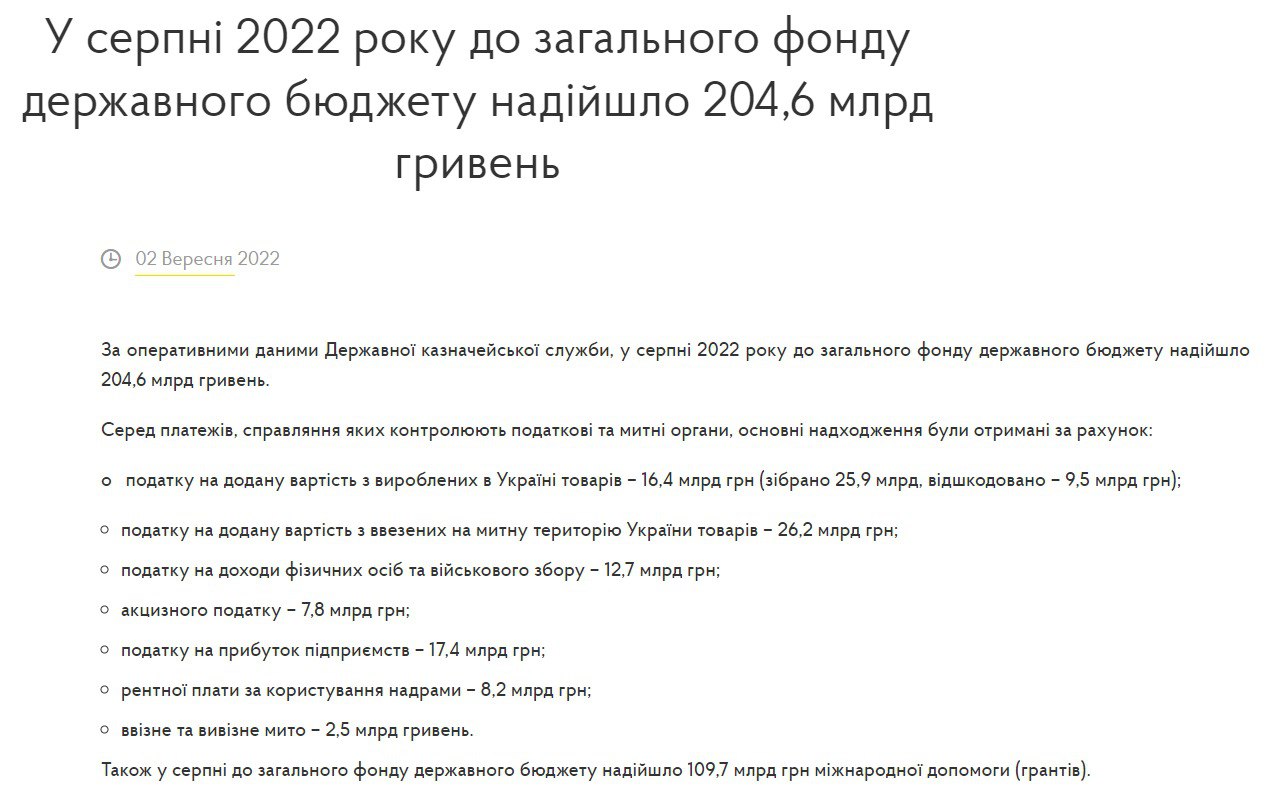 Из 204,6 млрд гривен доходов госбюджета Украины в августе 109,7 млрд – это западная помощь в виде грантов.