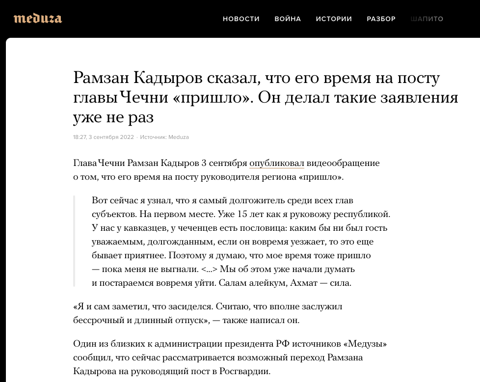 "Вот сейчас я узнал, что я самый долгожитель среди всех глав субъектов. На первом месте. Уже 15 лет как я руковожу республикой. У нас у кавказцев, у чеченцев есть пословица: каким бы ни был гость уважаемым, долгожданным, если он вовремя уезжает, то это еще бывает приятнее. Поэтому я думаю, что мое время тоже пришло — пока меня не выгнали... Мы об этом уже начали думать и постараемся вовремя уйти", - заявил Кадыров.