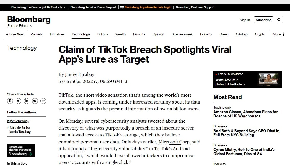 Данные всех 2 млрд пользователей TikTok могли быть украдены. Аналитики предполагают, что мог быть взломан один из серверов TikTok, на котором хранились личные данные пользователей.