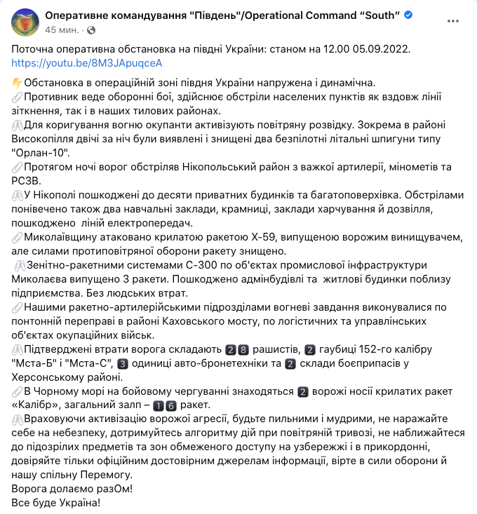 Об этом сообщает Оперативное командование "Юг".