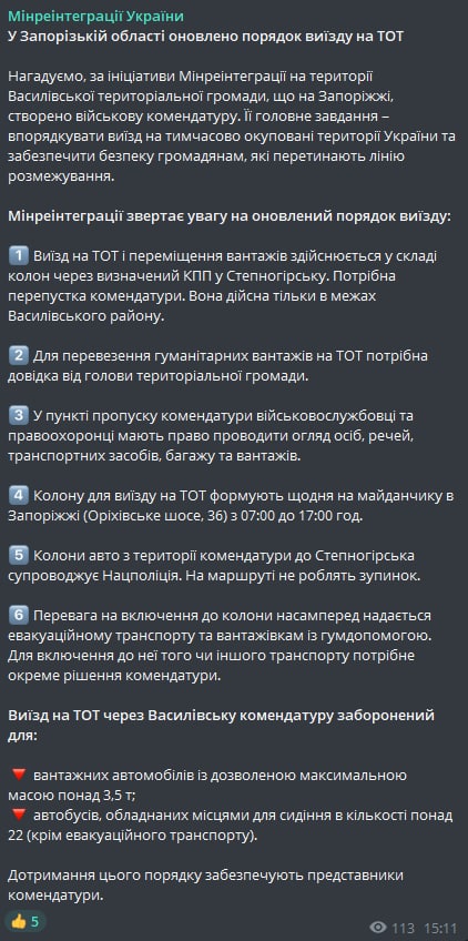 • Выезд на временно оккупированную территорию (ВОТ) и перемещение грузов осуществляется в составе колонн через определенный КПП в Степногорске. Нужен пропуск комендатуры. Она действительна только в пределах Васильевского района.