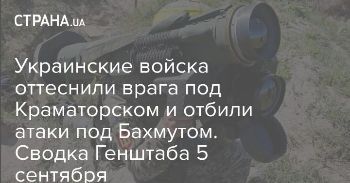 В Генеральном штабе Вооруженных сил Украины опубликовали оперативную сводку с фронта по состоянию на 18:00 5 сентября. Сообщается, что украинские войска оттеснили врага под Краматорском и отбили атаки под Бахмутом.