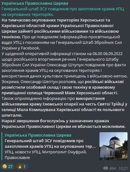10.40 Украинская православная церковь пишет про захват храмов УПЦ на оккупированных территориях, со ссылкой на информацию Генштаба ВСУ.