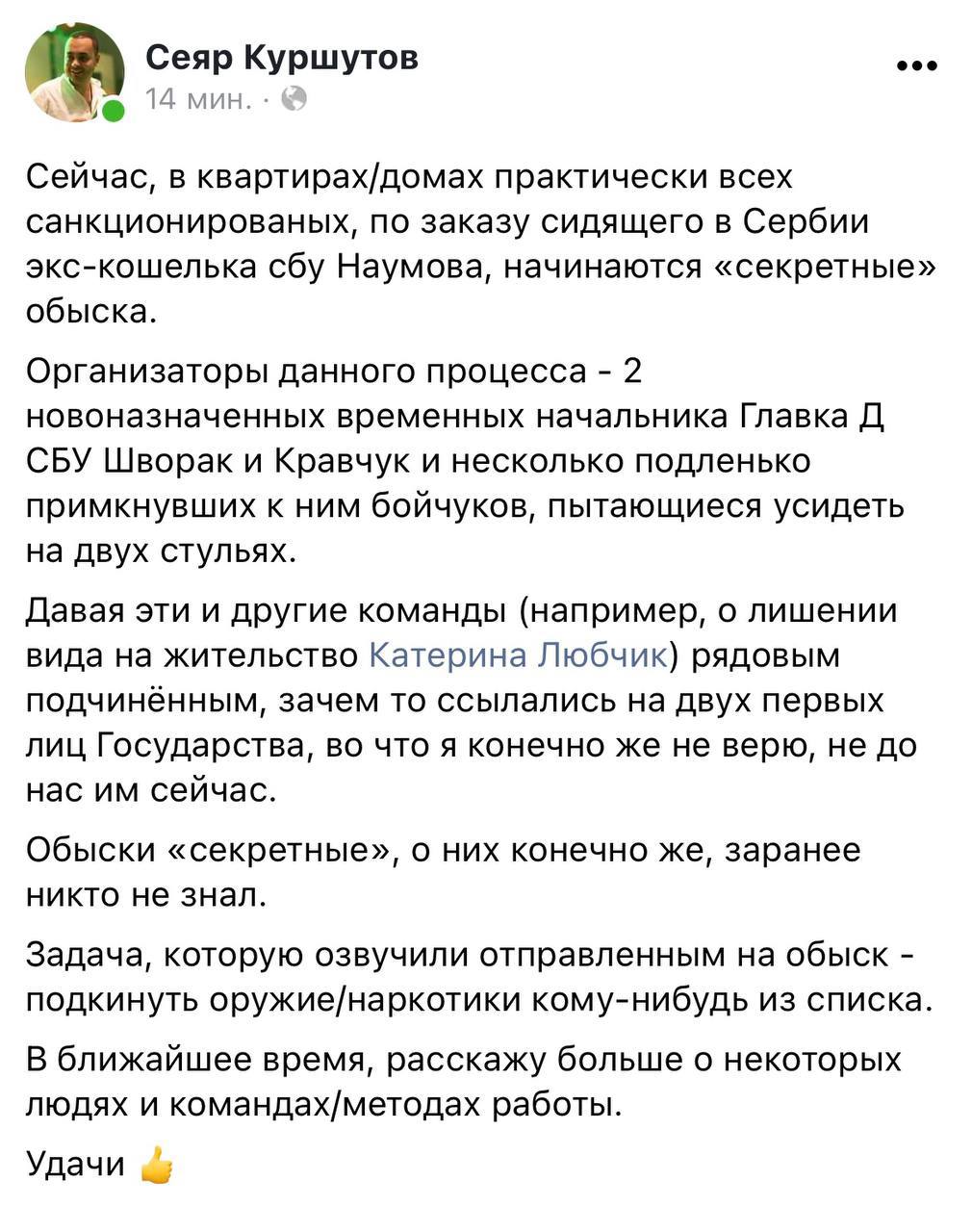 "Начинаются "секретные обыски". Организаторы данного процесса двое новоназначенных временных начальника Главка Д СБУ Шворак и Кравчук и несколько подленько примкнувших к ним бойчуков, пытающихся усидеть на двух стульях", - сообщил Куршутов на своей странице в Facebook.