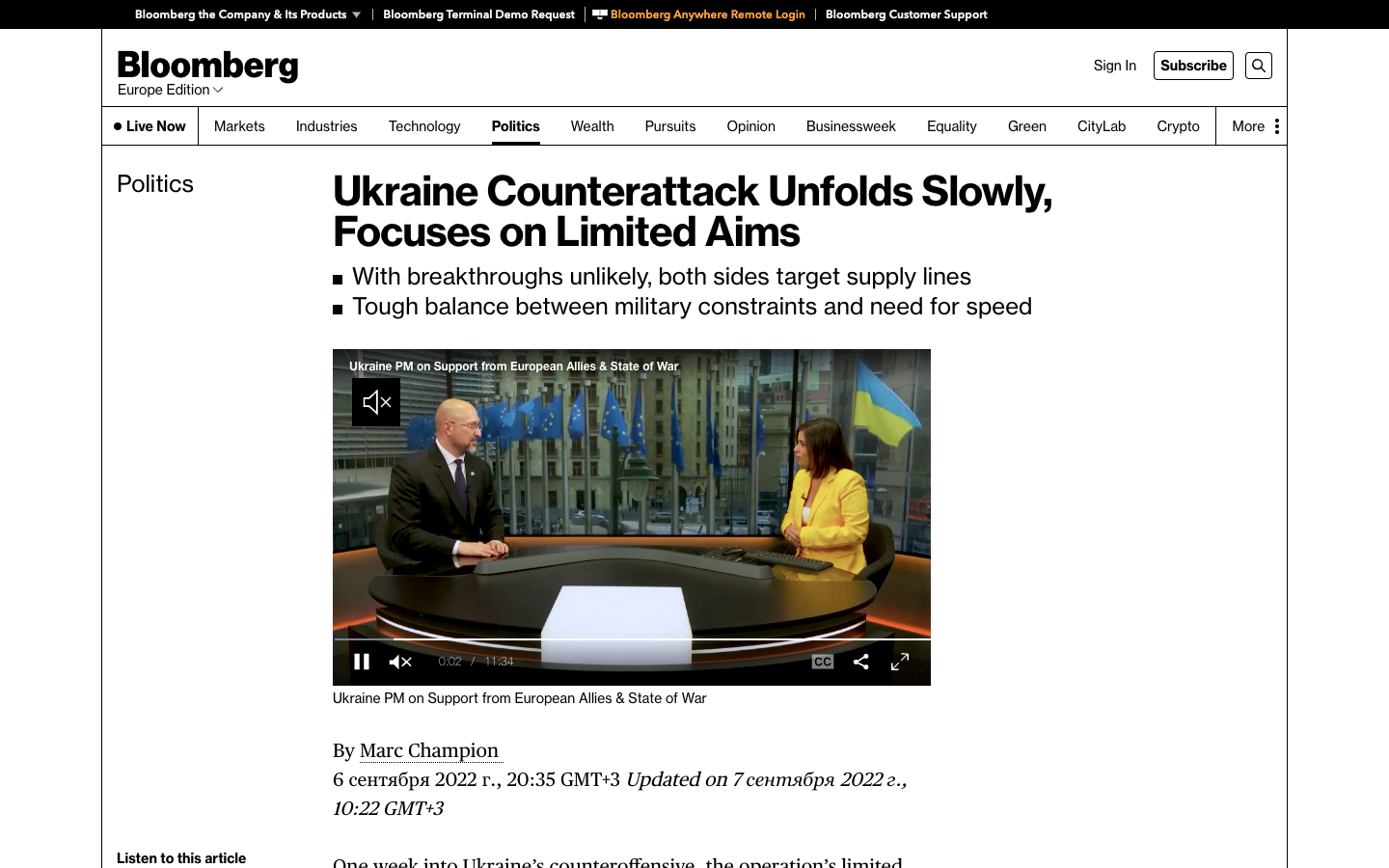 Однако, как сообщает агентство, "среди официальных лиц в Киеве также мало признаков триумфа". Премьер-министр Денис Шмыгаль заявил, что Украина считает, что время находится на стороне России, а Путин готов затянуть конфликт. Вместе со своими союзниками, сказал Шмыгаль, Украина должна "закончить эту войну как можно скорее".