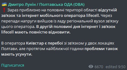Половина Полтавской области без связи и интернета lifecell. Местные власти озвучили сроки устранения проблемы