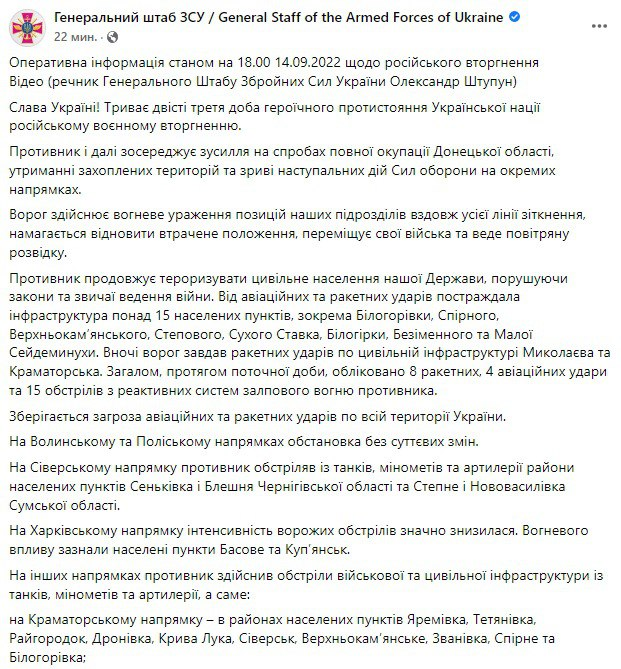 В среду, 14 сентября, идет 203-й день полномасштабного российского вторжения в Украину.