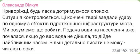 19:43 Глава военной администрации Кривого Рога Александр Вилкул подтвердил удар по инфраструктурному объекту города и заявил, что водоснабжение в Кривом Роге уже восстанавливается.