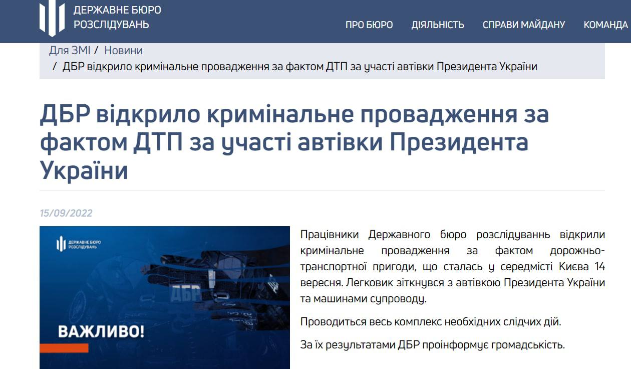 "Работники Государственного бюро расследований открыли уголовное производство по факту дорожно-транспортного происшествия, которое произошло в центре Киева 14 сентября. Легковушка столкнулась с машиной президента Украины и машинами сопровождения", - сообщает пресс-служба ГБР.