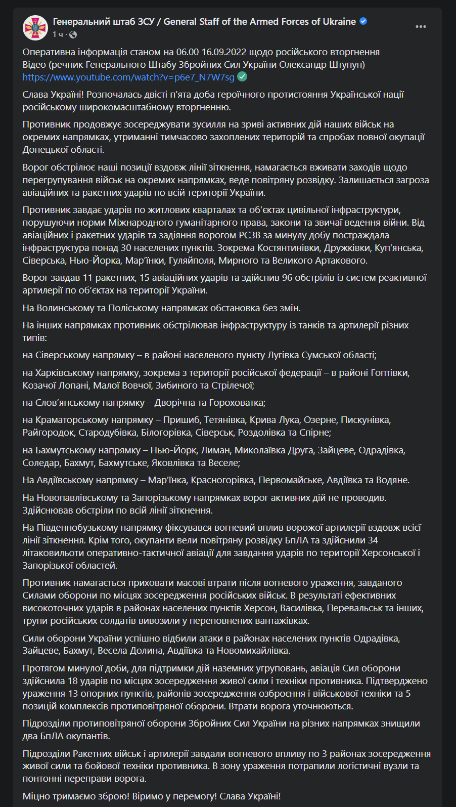 Утром в пятницу, 16 сентября, Генштаб ВСУ опубликовал актуальную сводку с фронта. Сообщается, что украинская авиация за сутки нанесла 18 ударов позициям россиян. Под удар попали логистические узлы и понтонные переправы ракетных подразделений врага. Подтверждено поражение 13 опорных пунктов, районов сосредоточения вооружения и военной техники и 5 позиций комплексов противовоздушной обороны.