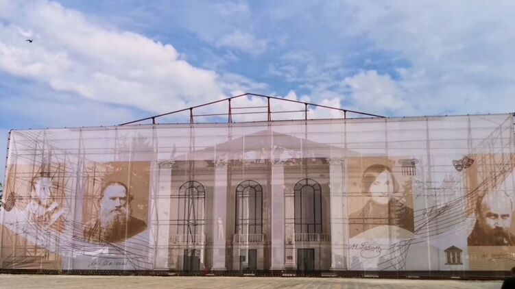 Вокруг Мариупольского драмтеатра ставят леса с портретами классиков украинской и русской литературы. Фото