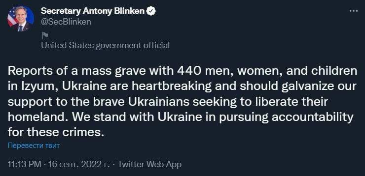 Госсекретарь США Энтони Блинкен заявил, что после обнаружения массовых захоронений в Изюме необходимо усилить поддержку Украины. Об этом он написал в Twitter.