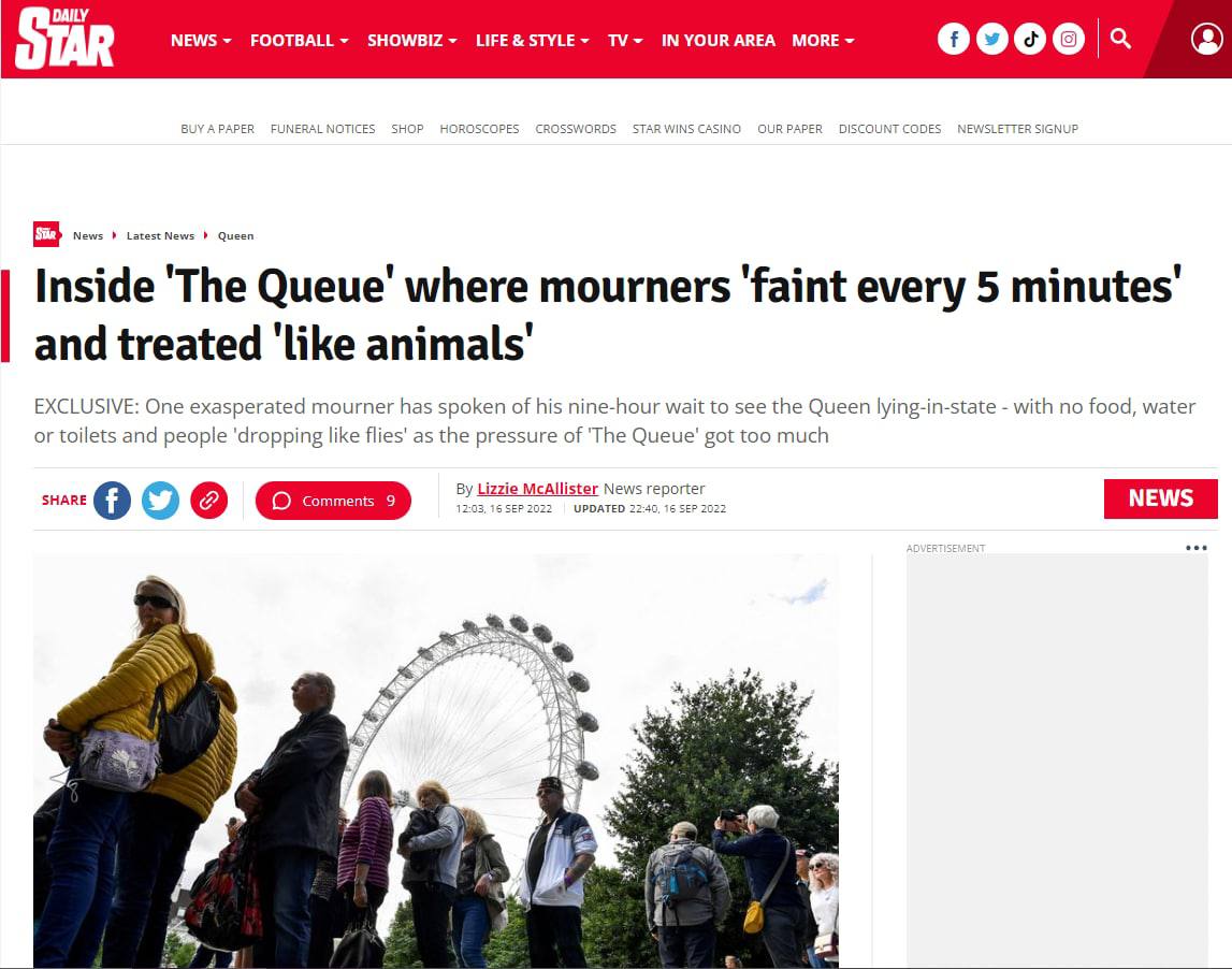 Один из скорбящих поделился своими впечатлениями от стояния в длинной очереди людей, ожидающих своей очереди увидеть покойную королеву. Ждать ему пришлось 9 часов. В итоге у него возникло впечатление, что со скорбящими "обращались как с животными": несколько человек были опрокинуты в давке, случаи обмороков происходили чуть ли не каждые 5 минут.