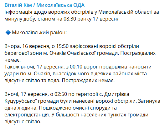 Что касается Очакова, то удары по городу наносились и вчера во второй половине дня, и сегодня утром. Пострадавших нет, но в некоторых районах города нет воды и электричества.