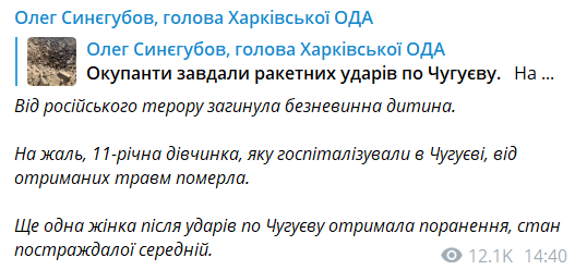 "К сожалению, 11-летняя девочка, госпитализированная в Чугуеве, от полученных травм скончалась", - написал Синегубов.
