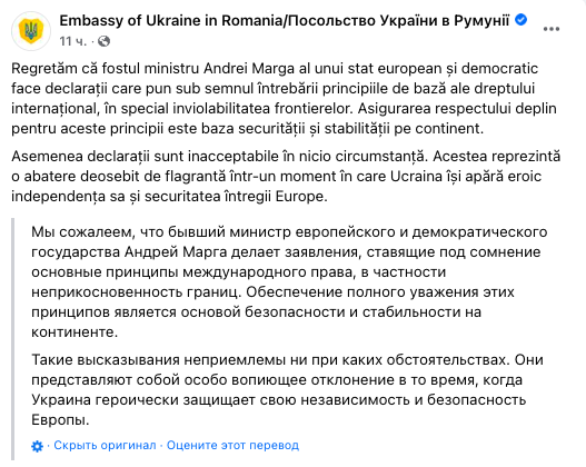 09.07 Посольство Украины в Румынии отреагировало на высказывание экс-главы МИД Румынии Андрея Марги о том, что границы Украины "неестественны".