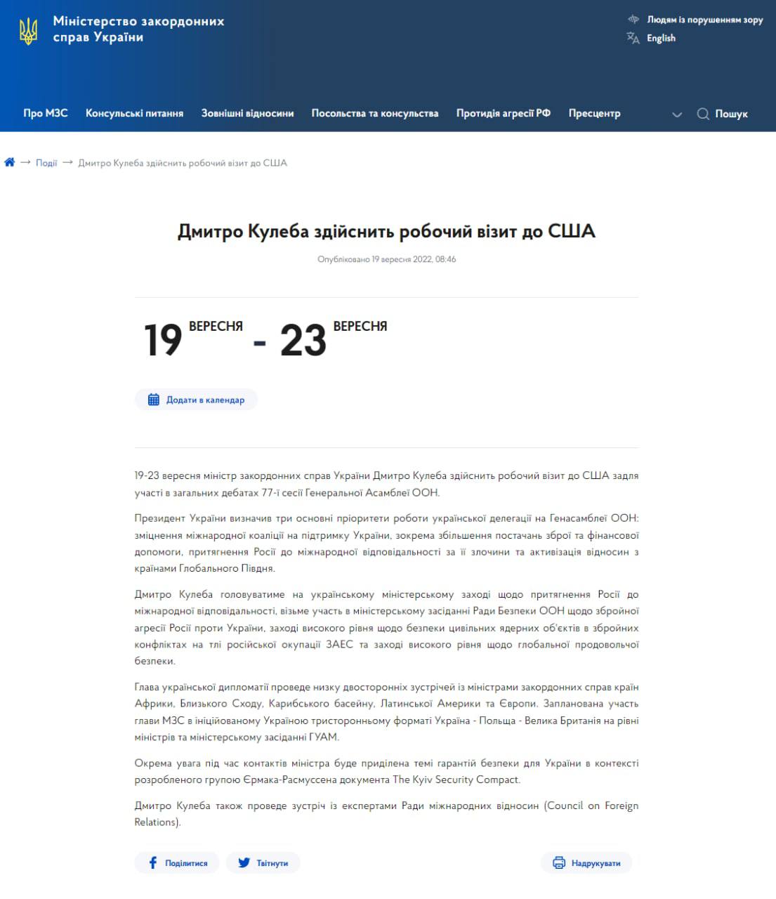 10:26 Глава МИД Украины Дмитрий Кулеба отправится в США для участия в дебатах на 77-й сессии Генеральной Ассамблеи ООН 19-23 сентября.