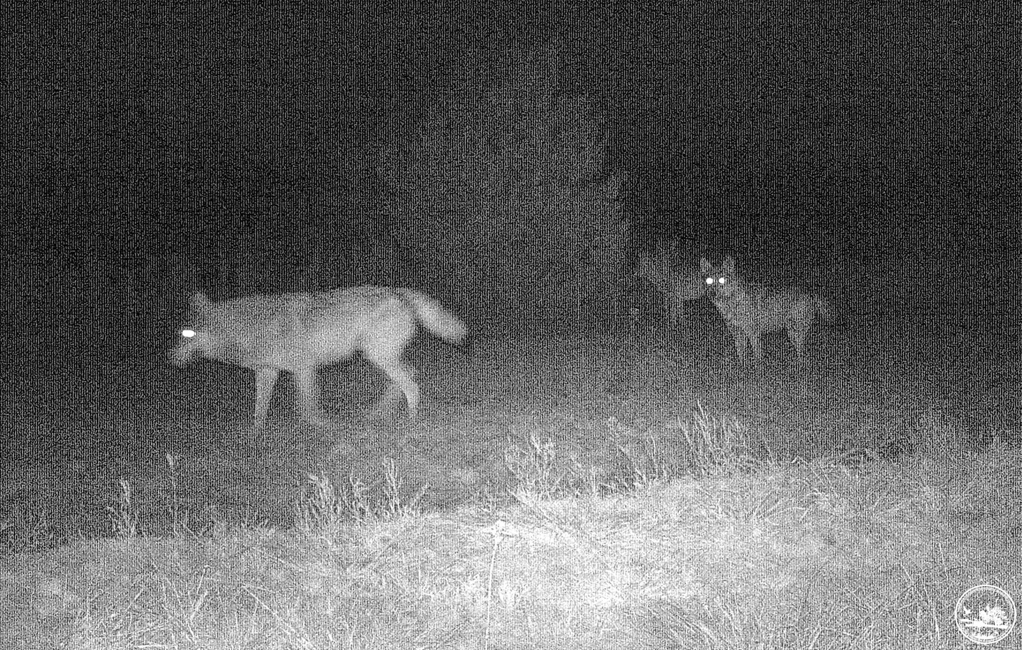 А вот в фотоловушку попали и серые хищники, для которых ночь - естественная пора охоты.
