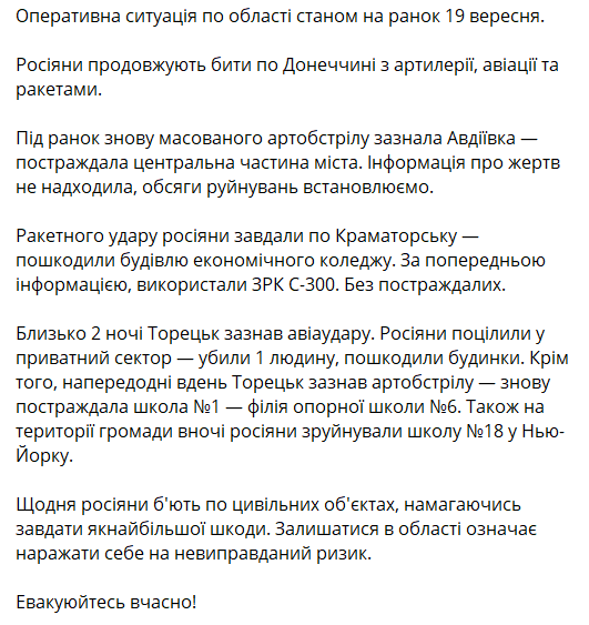 В 02:00 по частному сектору Торецка был нанесен авиаудар, погиб один человек. Накануне днем в Торецке из-за артобстрела пострадала школа №1 — филиал опорной школы №6. Также на территории громады ночью россияне разрушили школу №18 в Нью-Йорке.