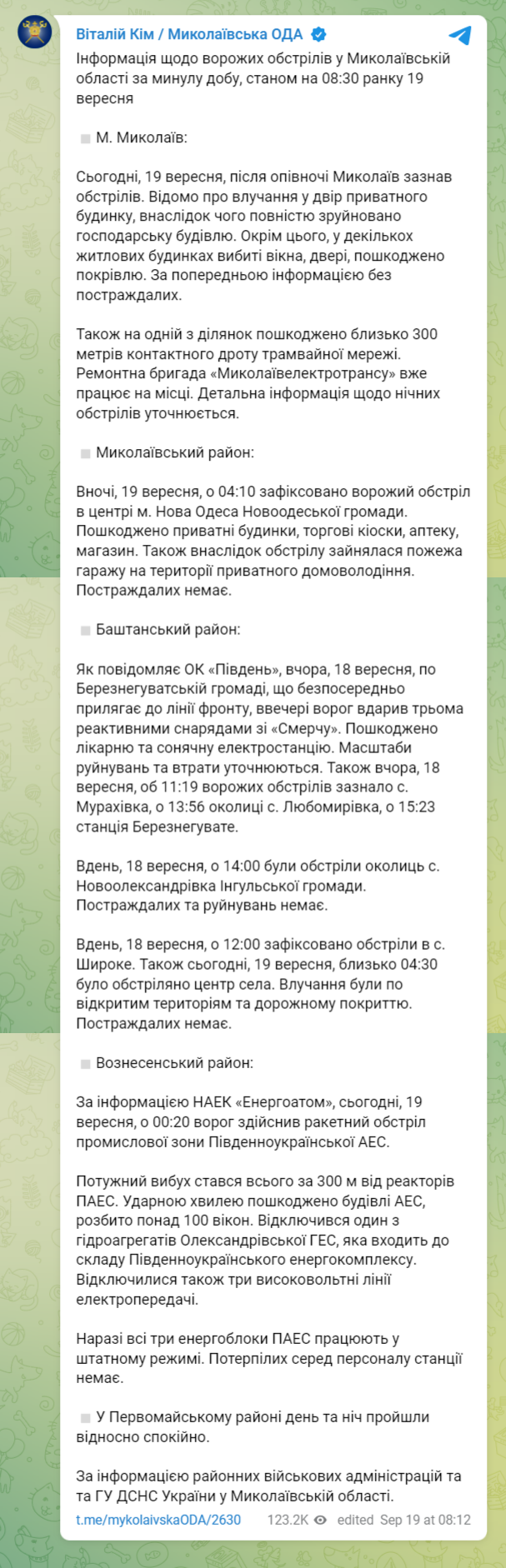 В 00:20 был ракетный обстрел промышленной зоны Южноукраинской АЭС в 300 м от реакторов ЮАЭС. Ударной волной повреждено здание АЭС, разбито более 100 окон. Отключился один из гидроагрегатов Александровской ГЭС, входящей в состав Южноукраинского энергокомплекса. Отключились также три высоковольтных линии электропередачи.