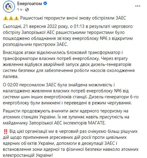 08:29 В ночь на 21 сентября под обстрел снова попала Запорожская АЭС. Повреждено оборудование связи одного из энергоблоков, сообщает пресс-служба Энергоатома.