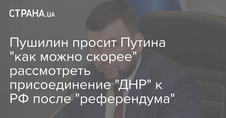 "Глава ДНР" Денис Пушилин призвал Путина "как можно быстрее" рассмотреть вопрос о вхождении в РФ "ДНР", если результат на "референдуме" будет соответствующим.