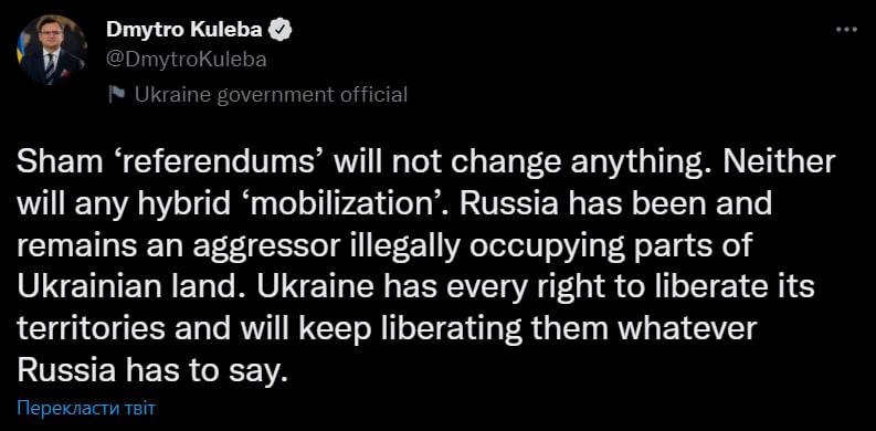 "Бутафорские "референдумы" ничего не изменят. Не будет и никакой гибридной "мобилизации". Россия была и остается агрессором, незаконно оккупировавшим часть украинской земли. Украина имеет полное право освободить свои территории и будет продолжать освобождать их, что бы ни говорила Россия", - написал Кулеба в Twitter.
