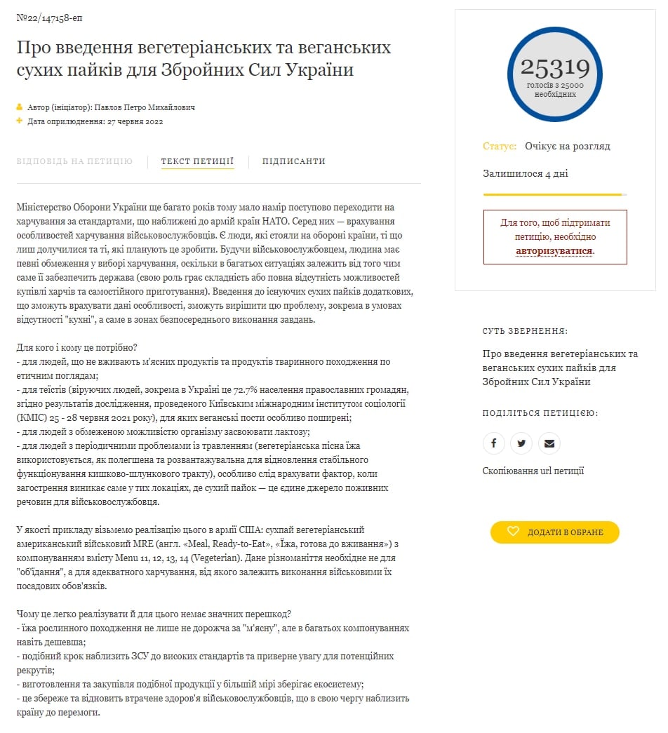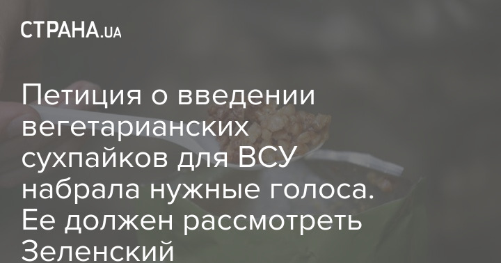 Петиция президенту Украины о введении вегетарианских и веганских сухих пайков для Вооруженных Сил Украины набрала более 25 тысяч голосов. Теперь обращение должен рассмотреть Владимир Зеленский.