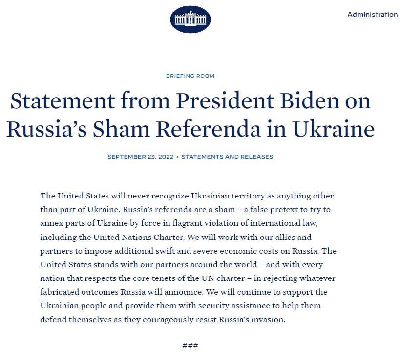 "Соединенные Штаты никогда не признают украинскую территорию ничем иным, кроме части Украины. Российские "референдумы" – это фикция, фальшивый предлог для попытки аннексировать силой части Украины, грубо нарушающий международное право, включая устав ООН", – говорится в заявлении президента США.