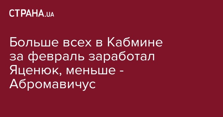 К слову, зарплата премьер-министра Арсения Яценюка за февраль составила 26 130 гривен, вице-премьер-министра – министра культуры Вячеслава Кириленко – 22 544,4 гривны, министра здравоохранения Александра Квиташвили – 7 636 гривны, министра информационной политики Юрия Стеця – 7 272,35 гривны.