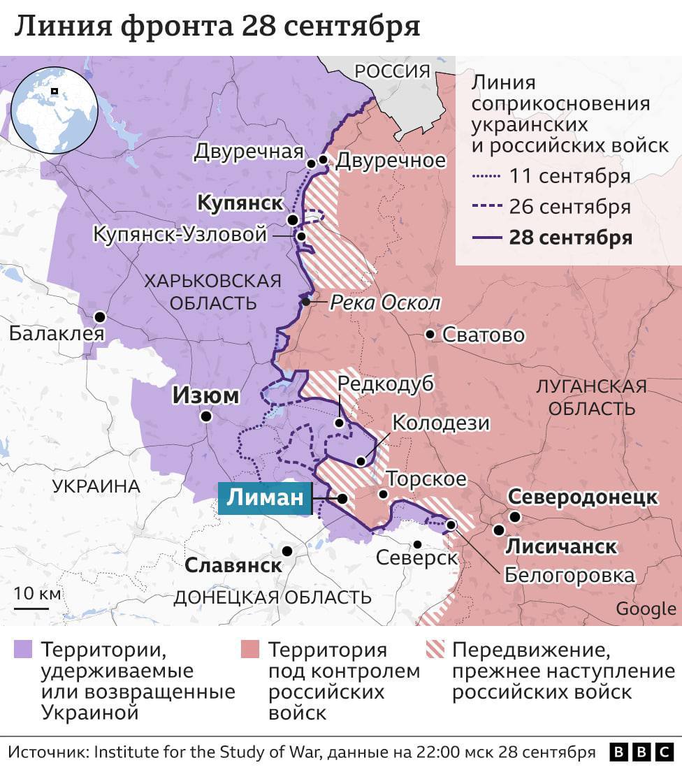 Российские медиа публикуют репортажи из Лимана и его окрестностей, где держат оборону российские подразделения. В том числе там есть и представители "Союза добровольцев Донбасса" - организации, созданной бывшим "премьером ДНР" российским политтехнологом, а ныне - депутатом Госдумы Бородаем. Бородай также присутствует в репортажах с тех мест и говорит, что обстановка тяжелая и украинские войска продолжают наступать крупными силами.
