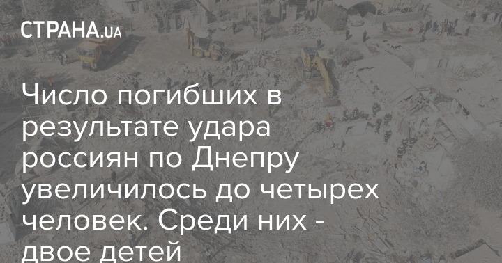 Число жертв после удара по Днепру в ночь на 29 сентября увеличилось до четырех человек. Погибли двое взрослых и двое детей - 8-летний мальчик и 9-летняя девочка.