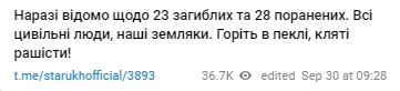 В результате российского обстрела гуманитарной колонны в Запорожье 23 мирных жителя погибли и еще 28 ранены.