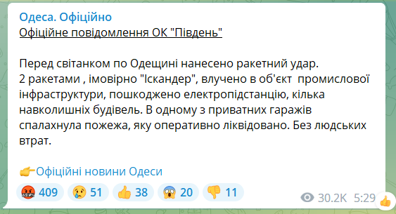 Россияне 1 октября перед рассветом нанесли ракетный удар по Одесской области. Две ракеты, предположительно "Искандер", попали в объект промышленной инфраструктуры.