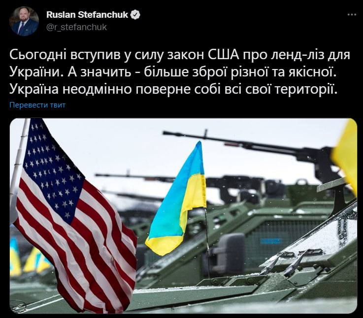 "Сегодня вступил в силу закон США о ленд-лизе для Украины. А значит - больше оружия разного и качественного. Украина непременно вернет себе все свои территории", - написал Стефанчук в твиттере.