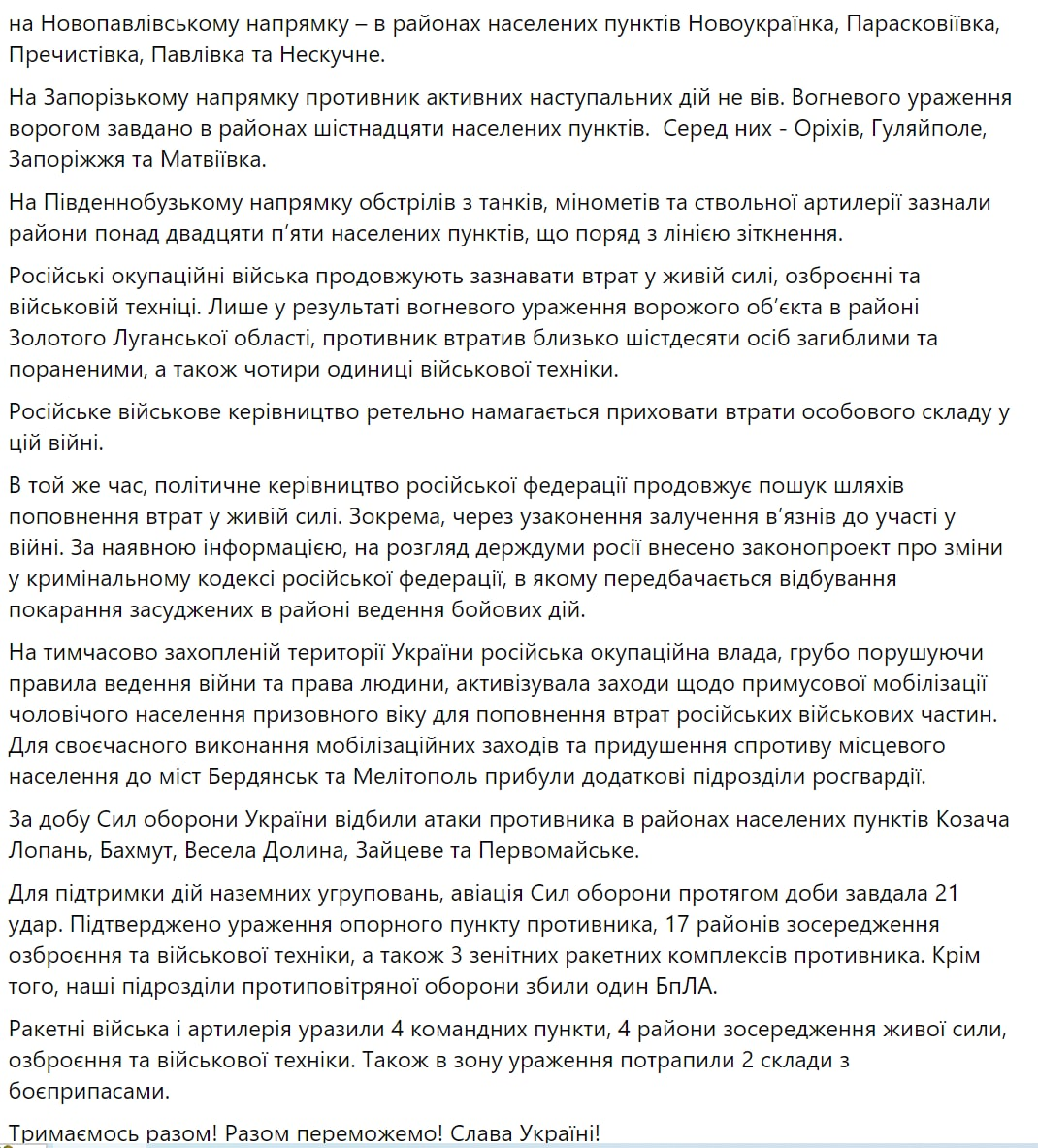 Генеральный штаб Вооруженных сил Украины опубликовал свежую сводку с фронта.