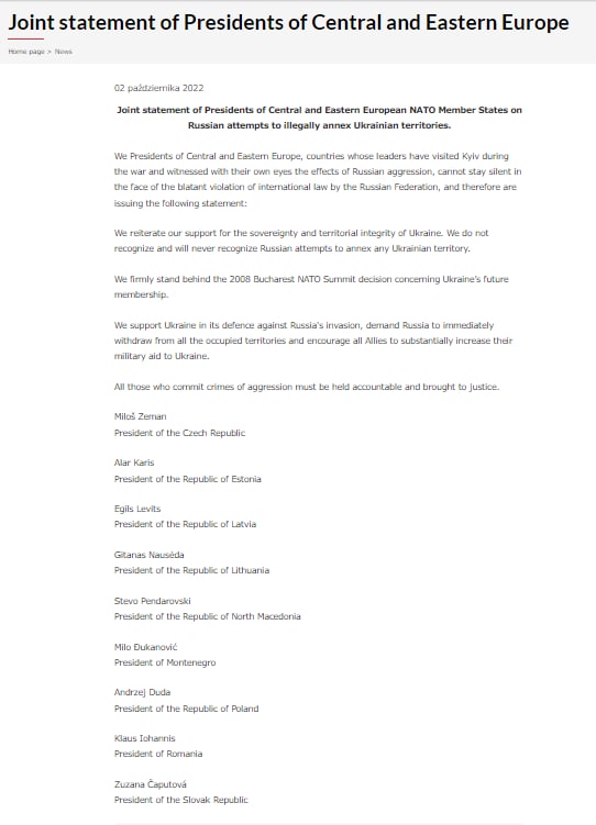 Президенты девяти стран НАТО из Центральной и Восточной Европы выразили поддержку решению Бухарестского саммита НАТО 2008 года относительно будущего членства Украины в Альянсе.
