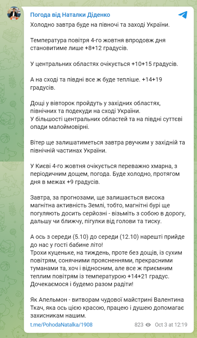 Об этом пишет синоптик Наталья Диденко в телеграм-канале.