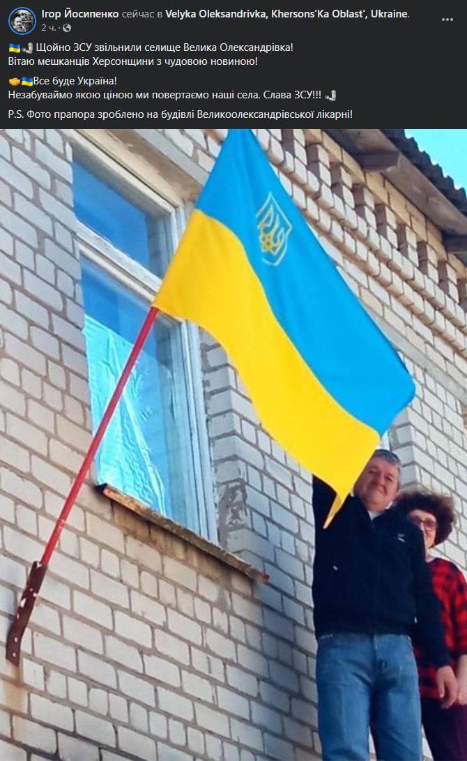 21:54 Видео установки украинского флага в Архангельском Херсонской области. О его освобождении сообщили позавчера.