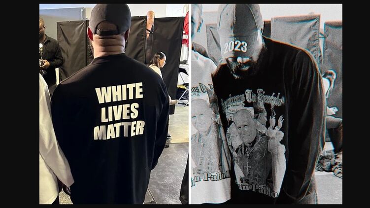 Надпись расположена на футболке сзади, а спереди изображен бывший папа римский Иоанн Павел Второй. Лонгслив надели как сам Йе, так и американская активистка Кэндис Оуэнс, а также модели на подиуме.