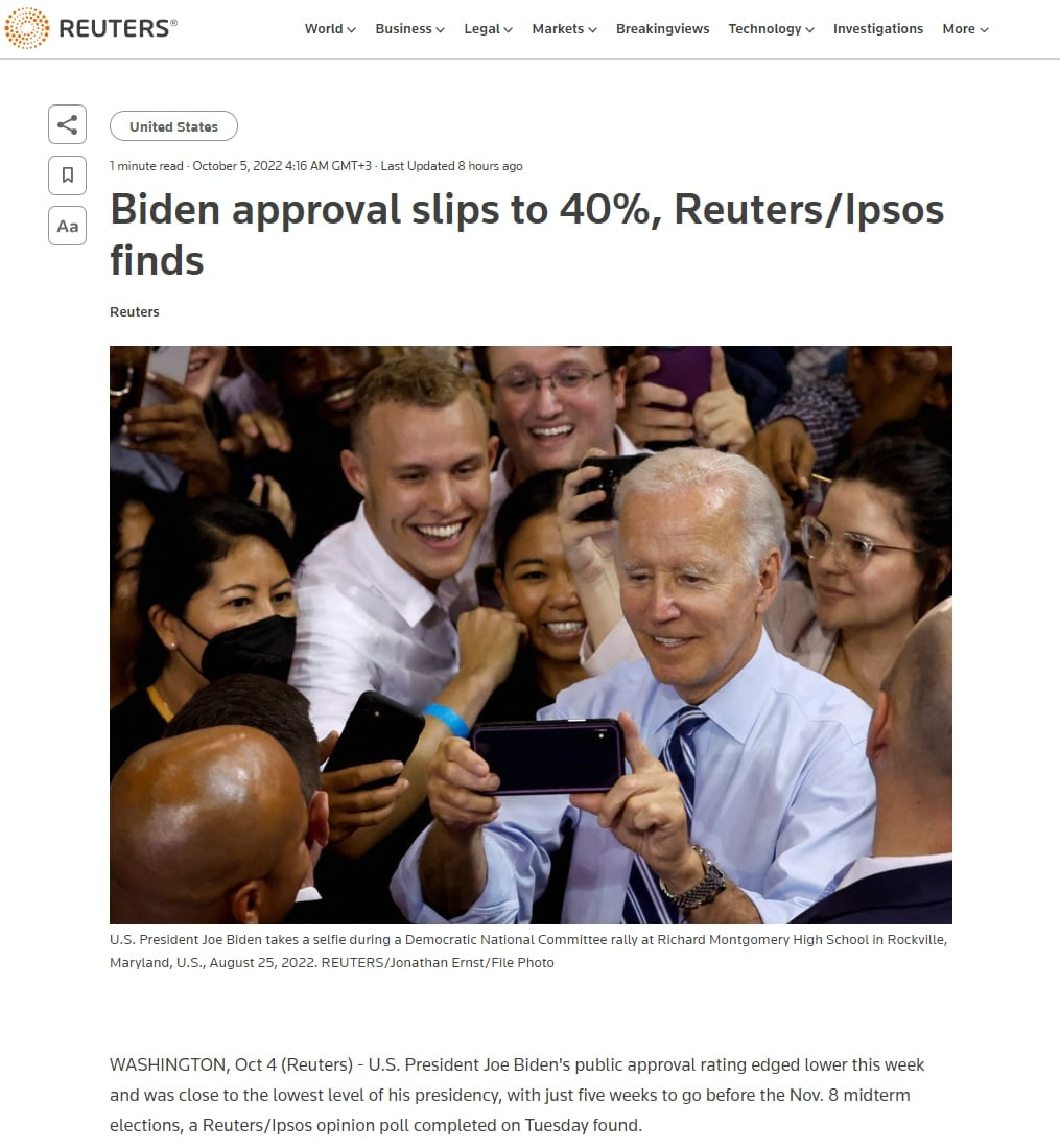 Рейтинг Байдена за пять недель до промежуточных выборов приблизился к самому низкому уровню за все время