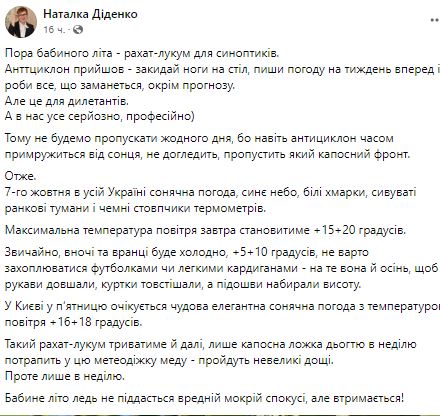 Синоптик Наталья Диденко пишет, что 7-го октября по всей Украине солнечная погода и синее небо. Максимальная температура воздуха сегодня составит +15...+20.