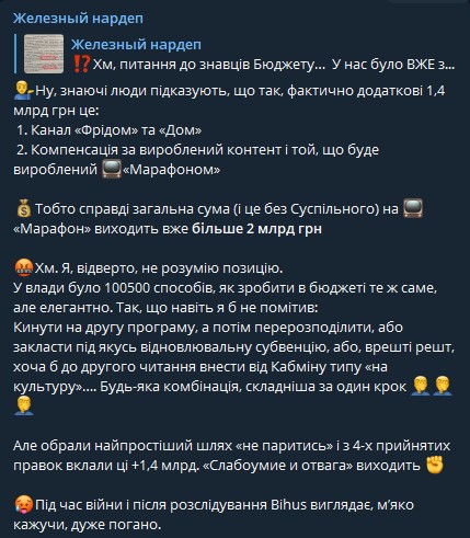 По его данным, из 2 млрд грн 1,4 миллиарда пойдет на каналы "Дом" и Freedom, а также на компенсацию за произведенный контент.