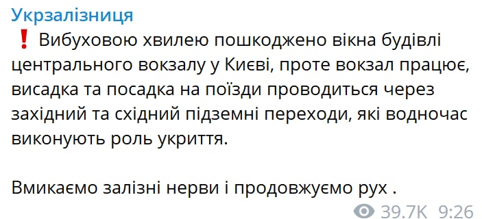 Взрывы повредили крышу и окна центрального жд-вокзала в Киеве, сообщает "Укрзализныця".
