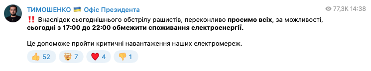 "Это поможет пройти критические нагрузки наших электросетей", - написал замглавы Офиса президента Кирилл Тимошенко.