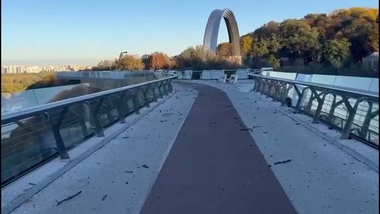 Появилось видео, как сейчас выглядит пешеходно-велосипедный мост через Владимирский спуск, известный как мост Кличко, рядом с которым утром угодила ракета.