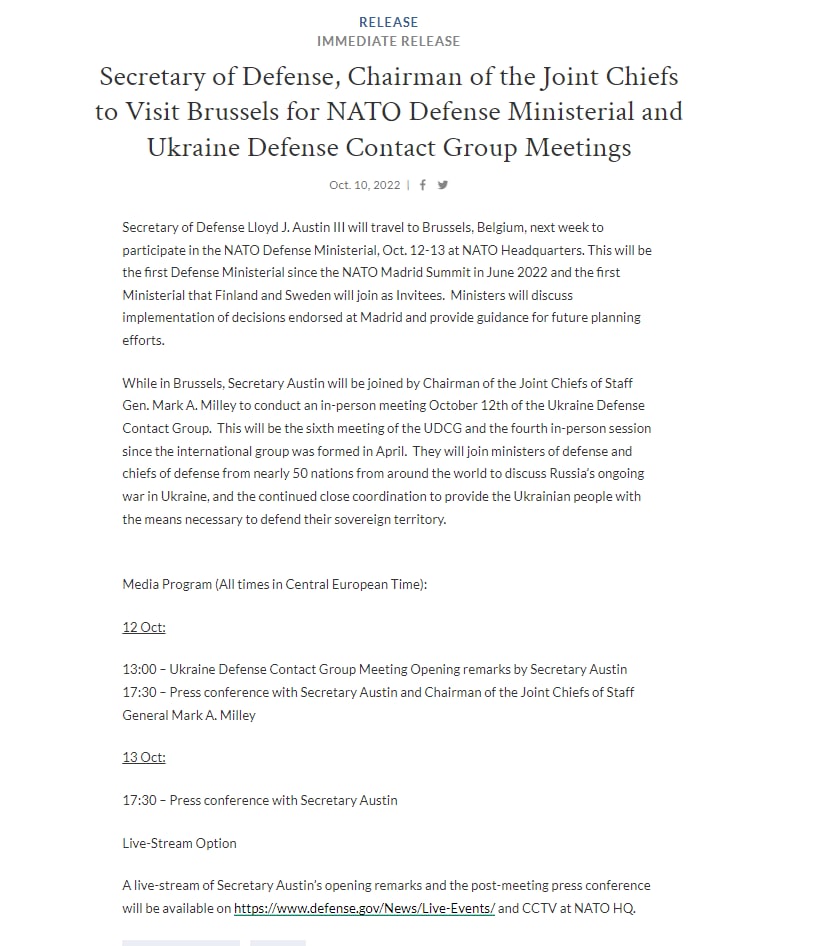 В среду, 12 октября, в Брюсселе начнется двухдневная встреча министров обороны стран НАТО. На нее приедут глава Пентагона Ллойд Остин и глава комитета начальников штабов Марк Милли.