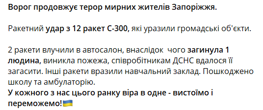 Утром войска РФ выпустили по Запорожью 12 ракет С-300. В результате удара погиб один человек.