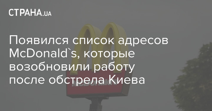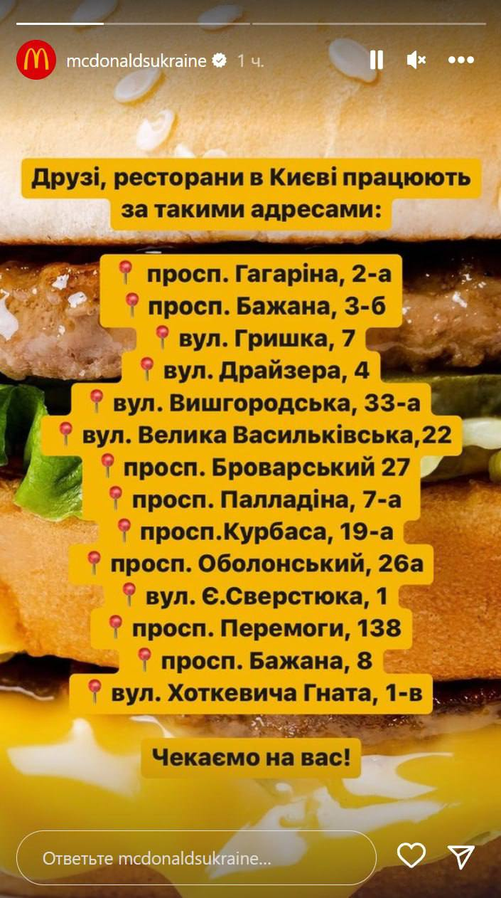 McDonald's опубликовал в Instagram список адресов заведений, которые возобновили работу после вчерашних обстрелов в Киеве.